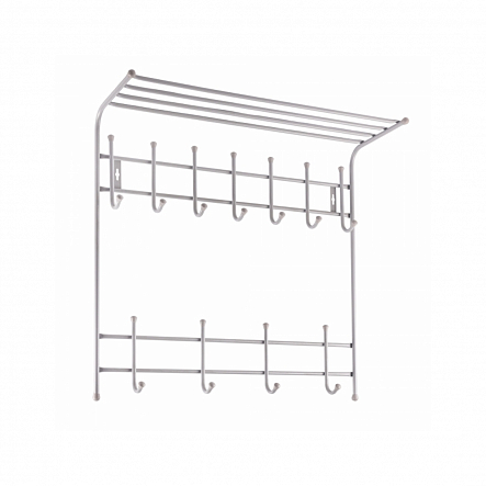 Удобный и надёжный вариант для организации пространства. 11 прочных крючков позволяют разместить верхнюю одежду и аксессуары, а полка сверху подходит для сумок, шапок или обуви. Матовый серый цвет придаёт современный стиль, а долговечный металл гарантирует долгий срок службы.