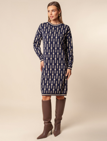 Платье жаккардовой вязки выполнено из мягкой пряжи на основе вискозы с добавлением кашемира. Модель свободного силуэта подходит для любой фигуры. Нежная пряжа очень комфортно ощущается на теле, сохраняя оптимальное тепло при этом не перегревая. Совет стилиста: жаккардовое платье отличная инвестиция в базовый гардероб, которая поможет создать дорогие образы. Носите с высокими сапогами удлиняя силуэт или плотными колготками.