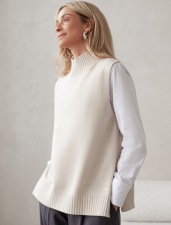 Жилет с воротом стойка выполнен из мягкой пряжи с кашемиром. Модель дополнена боковыми разрезами. Хорошо сочетается лонгсливами и блузками. Мягкая пряжа очень приятная к телу, поддержит комфорт на протяжении всего дня, при этом не перегревая. Сочетается в костюме с брюками D38.013, D38.012 и юбкой D36.016