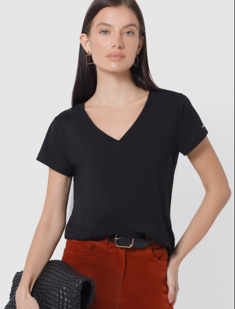Однотонная футболка с V-образным вырезом выполнена из премиального хлопка. Добавление эластана в состав изделия способствует формоустойчивости. Самое высокое качество длинноволокнистых хлопковых волокон обеспечивает комфорт в любое время года. Совет стилиста: очищенная от декора базовая модель будет уместна не только в повседневном образе с денимом, но и в офисе с нестрогим дресс-кодом, в паре с брюками и жакетом.