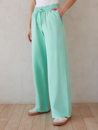 Брюки выполнены из футера двухнитки с эластаном. Модель прямого кроя дополнена боковыми карманами и одним задним карманом. Пояс выполнен из эластичного трикотажа в рубчик. В пояс вставлен плоский хлопковый шнур в тон изделия с серебристыми наконечниками. Изделие дополнено металлическим логотипом бренда. Сочетается в костюме с жакетом D49.078, джемпером D49.079, D49.080 и футболкой D49.081