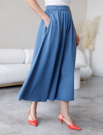 Юбка полусолнце выполнена из лиоцелла. Сзади застежка на потайную молнию. Ткань с характерным атласным блеском полностью имитирует обычный деним, но в тоже время намного более мягкая, плавно струится по телу, хорошо драпируется и охлаждает кожу в жаркое время года. Изделие сочетается в костюме с блузкой D59.017