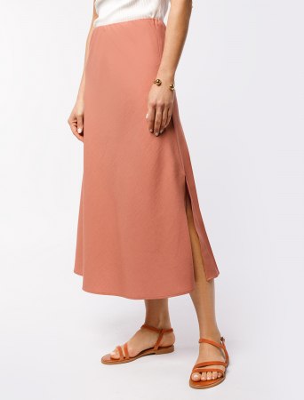 Юбка с разрезом выполнена из плотного лиоцелла. Модель, скроенная по косой мягко, струится по телу и отлично драпируется. Удобный пояс на эластичной резинке. В теплое время года ткань приятно охлаждает кожу. Добавление синтетических волокон в составе изделия, предотвращает сминаемостьи поддерживает формоустойчивость. Юбка сочетается в костюме с топом D23.063, блузкой D29.266, D29.267 и жилетом D27.002