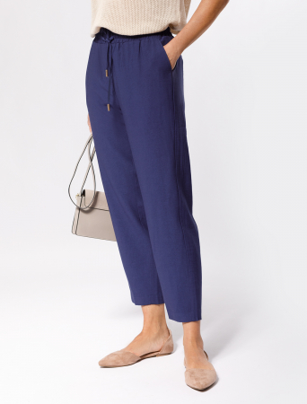 Брюки выполнены из плотного лиоцела. Добавление синтетических волокон в составе изделия предотвращает сминаемость. Эластичный пояс на резинке с регулируемым шнуром комфортно фиксирует изделие не сковывая движений. Модель дополнена боковыми карманами и металлическим логотипом бренда. Для создания завершенного образа сочетайте в костюме с топом D23.058, блузкой D28.054, D29.238, D29.239 и D29.240
