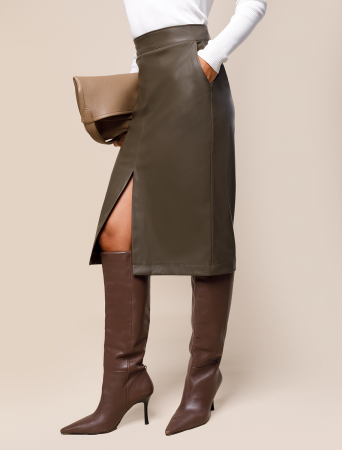 Юбка-карандаш с высокой посадкой на талии, выполнена из эластичной эко-кожи. Материал не уступает в прочности натуральной коже и легко тянется, не мешая движениям. Бархатистая внутренняя сторона очень приятна к телу, держит тепло и создана для ощущения полного комфорта. Модель дополнена карманами по бокам, а нужный эффект создает вертикальный шов спереди, переходящий в соблазнительный разрез.