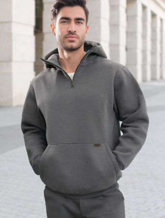 Худи выполнено из премиального футера-трехнитки с начесом. Теплая модель дополнена удобным карманом кенгуру и темно-серебристой молнией на вороте. Благодаря регулировке воротника можно носить изделие по-разному, как джемпер и как худи. Сочетайте в костюме с брюками U44.002
