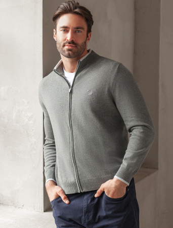Кардиган на молнии выполнен из гладкой хлопковой пряжи с добавлением нейлона. Модель дополнена вышитым логотипом бренда и контрастными полосками на рукавах и на стойке. Фурнитура цвета темный никель. Изделие хорошо сохраняет тепло, не перегревая тело. Сочетается вторым слоем с футболками, рубашками и поло. Подходит для любого типа фигуры.