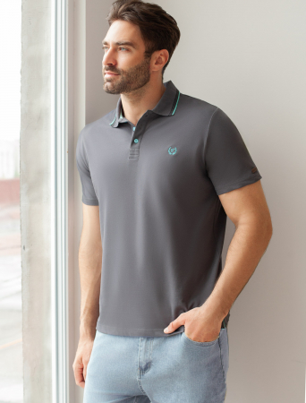 Футболка-поло выполнена из фактурного трикотажа. Модель с прямого кроя с небольшими разрезами по бокам дополнена вязаным воротником с контрастными пуговицами в тон тонкой полосы и вышитым логотипом бренда. Премиальный хлопковый трикотаж гарантирует комфорт и износостойкость. На рукаве брендированная нашивка из эко-кожи.