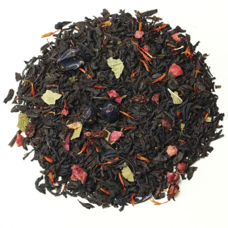 Черный цейлонский чай, шиповник, брусника, черноплодная рябина и кусочки ананаса. Аромат спелого барбариса.