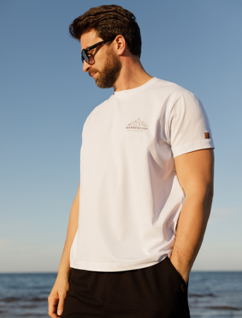 Футболка выполнена из премиального хлопка с эластаном. Авторский принт нанесен фактурными красками с устойчивым покрытием. Изделие комфортно сидит по фигуре, не сковывая движений. За счет среднего объема, хорошо подойдет как первый слой под пиджак, кардиган или бомбер. На рукаве нашивка из эко-кожи с логотипом бренда.