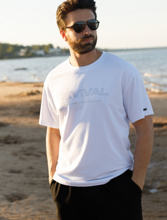 Перевод принта: Revival of the generation - возрождение поколения. Футболка свободного кроя выполнена из премиального хлопка. Авторский принт нанесен красками с устойчивым покрытием. Благодаря эластану, носить изделие очень комфортно, и оно сохранит свой безупречный вид в течение долгого времени. На рукаве нашивка из эко-кожи с логотипом бренда.
