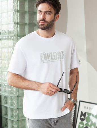 Перевод принта: Explore the great outdoors - исследуй мир. Футболка свободного кроя выполнена из премиального хлопка. Авторский принт нанесен красками с устойчивым покрытием. Благодаря эластану, носить изделие очень комфортно, и оно сохранит свой безупречный вид в течение долгого времени. На рукаве нашивка из эко-кожи с логотипом бренда.