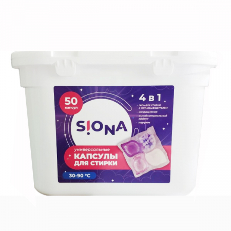 SIONA Универсальные капсулы для стирки – это инновационное решение для вашего ежедневного ухода за одеждой, сочетающее в себе мощь геля для стирки с пятновыводителем, кондиционером, антибактериальным эффектом и восхитительным парфюмом. Каждая капсула, предназначенная для стирки всех типов тканей, за исключением шерсти и шелка, аккуратно укутывает ваши вещи в заботу и защиту.