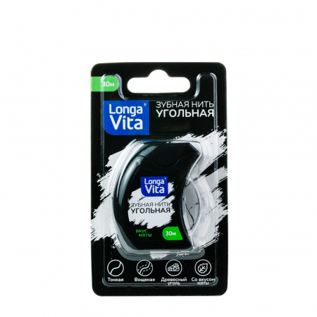 Зубная нить Longa Vita, арт. DF-01, угольная. Со вкусом мяты. Длина 30 м. Тонкая вощеная зубная нить для очищения межзубного пространства от налета и остатков пищи. Это позволяет бороться с развитием кариеса и болезнями десен. Древесный уголь дополнительно оказывает антибактериальный эффект, препятствует размножению бактерий. Эфирное масло мяты придает приятный вкус и освежает дыхание.
