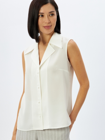 Блузка из однотонной легкой ткани. Без рукавов. Прямой силуэт. Английский удлиненный воротник. Застежка на петли и пуговицы на ножке. Разрезы в боковых швах. Рост модели 170 см. Изделие на модели 42 р-ра. Длина изделия по спинке 60 см.