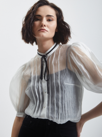 Прямой силуэт. Воротник-стойка с настроченной лентой-завязкой. Рукав короткий на манжете со сборкой и сборкой по плечу. На полочке декоративные отстроченные защипы. Застежка на петли и пуговицы по центру полочки. Рост модели 170 см. Изделие на модели 42 р-ра. Длина изделия по спинке 65 см. Деликатная стирка при 30 градусах.