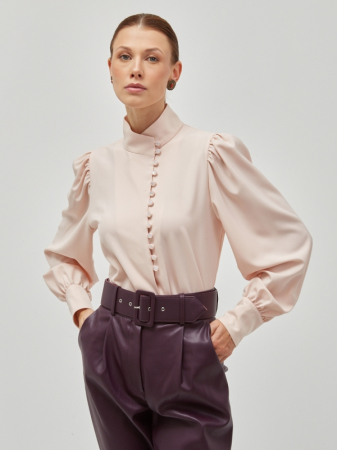 Блуза-косоворотка прямого силуэта с длинным рукавом на высокой манжете из плотной блузочной ткани. Воротник и манжеты изделия украшены большим количеством воздушных петель и мелких пуговиц,окрашенных в тон ткани. Рост модели 172 см. Блузка на модели 42-го размера. Машинная деликатная стирка.