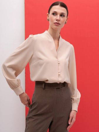 Блузка прямого силуэта. Из однотонной блузочной ткани. Воротник-стойка с V-образным вырезом.Рукав втачной, длинный со сборкой по плечу и по низу, на манжете. Застежка на навесные петли и пуговицы на ножке. Рост модели 170 см. Изделие на модели 42 р-ра. Длина изделия по спинке 63 см.