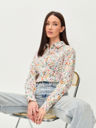 Блузка из хлопка и из штапеля с цветочным принтом. Прямой силуэт с разрезами по боковым швам. Рубашечный воротник на стойке с планкой. Рукав втачной, длинный на манжете. Супатная застежка на петли и пуговицы. Стойка воротника выполнена из контрастной ткани. Рост модели 170 см. Изделие на модели 42 р-ра. Длина изделия по спинке 65 см.