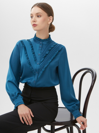 Блузка из однотонной ткани. Воротник-стойка с рюшей. Рукав втачной, длинный на манжете со сборкой. По полочке декоративные рюши и зашипы. Прямой силуэт. Застежка на петли и пуговицы по планке и манжете рукава. Рост модели 170 см. Изделие на модели 42 р-ра. Длина изделия по спинке 59 см. Деликатная стирка при 30 градусах.