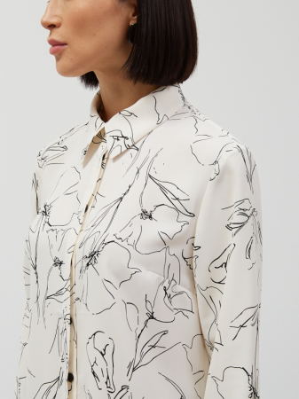Блузка из легкой ткани с цветочным принтом. Прямой силуэт с разрезами по боковым швам. Рубашечный воротник на стойке с планкой. Рукав втачной, длинный на манжете. Супатная застежка на петли и пуговицы. Рост модели 170 см. Изделие на модели 42 р-ра. Длина изделия по спинке 68 см. Деликатная стирка при 30 градусах.