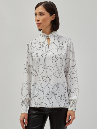 Блузка прямого силуэта. Плательно-блузочная ткань с цветочным принтом. Рубашечный воротник на стойке. Вырез на горловине полочки. Рукав втачной, длинный со сборкой на манжете. Застежка на петли и пуговицы на стойке и манжете. Рост модели 170 см. Изделие на модели 42 р-ра. Длина изделия по спинке 62 см.