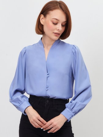 Блузка прямого силуэта. Из однотонной блузочной ткани. Воротник-стойка с V-образным вырезом.Рукав втачной, длинный со сборкой по плечу и по низу, на манжете. Застежка на навесные петли и пуговицы на ножке. Рост модели 170 см. Изделие на модели 42 р-ра. Длина изделия по спинке 63 см.