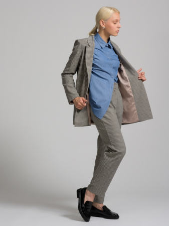 Жакет на подкладке, полуприлегающего силуэта из костюмной ткани. Воротник отложной с лацканами. Рукав втачной длинный с пуговицами по шву низа. Двубортный, слегка удлиненный. Боковые прорезные карманы в рамку с клапаном. Застежка на пуговицы в два ряда. Рост модели 175 см. Изделие на модели 42р-ра. Длина изделия по спинке 74 см. Машинная стирка при 30°