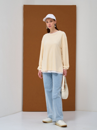 Свободный женский свитшот - оверсайз из мягкого велюра на трикотажной основе. Круглый вырез горловины. Спущенная линия плеча. Длинный прямой рукав. Свитшот не только удобный и стильный, но и легко впишется в комплект домашней одежды и одежды для прогулок и отдыха. Ткань легкая и очень приятная к телу, подарит невероятный комфорт и уют своей обладательнице. Для большего удобства в изделии имеются разрезы по боковым швам. Рост модели 175 см. Изделие на модели 42р-ра. Длина изделия 75.3 см. Машинная стирка при 30 градусах
