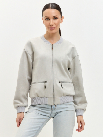 Бомбер на подкладке, из однотонной искусственной замши. Свободный силуэт. Горловина, манжеты и низ изделия из трикотажной ткани (обвяз). Линия плеча спущена. По окату рукава встречная складка. Застежка на молнию. В боковой части полочки горизонтальные прорезные карманы на молнии. Рост модели 170 см. Изделие на модели 42 р-ра. Длина изделия по спинке 57,3 см. Деликатная стирка при 30 градусах.