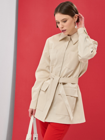 Блузка-куртка из ЭКО-кожи прямого силуэта. Модель прямого силуэта с накладными функциональными карманами, в комплекте пояс из основной ткани. Застежка-планка на кнопках. Рукава втачные со сборкой по низу и манжетами на кнопке. Воротник отложной на стойке. Рост фотомодели 175 см. Рекомендация по уходу химчистка.