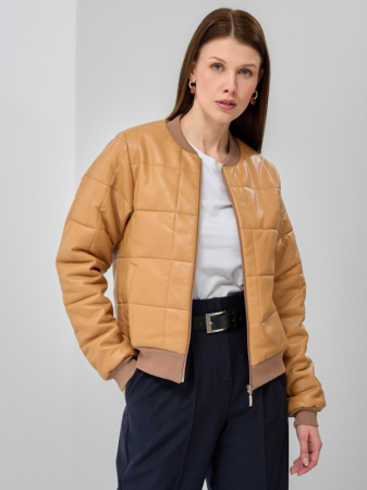 Модный укороченный бомбер из стеганой костюмной ткани и эко-кожи, на подкладке. Стежка на синтепоне, рисунок-ромб и полоса. Рукав втачной, длинный. Манжеты рукавов, горловина и низ изделия выполнены из кашкорсе. Карманы на полочке прорезные с листочкой. Застежка по центру на молнию. Рост модели 175 см. Изделие на модели 42р-ра. Длина изделия по спинке 59 см.