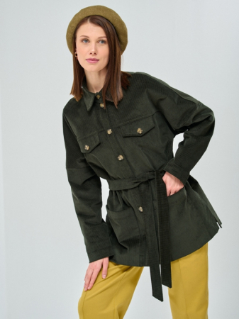 Женская рубашка – оверсайз из ткани вельвет, на подкладке. Спущенная линия плеча. Рубашечный воротник на стойке и планке. Кокетка по спинке и полочке с декоративными клапанами. Втачной прямой рукав с высокой подгибкой, за счет которой рукав можно подвернуть. Разрезы в нижней части бокового шва для большего комфорта. Большие накладные, удобные карманы на полочке. В комплекте съёмный пояс из основной ткани. Рост модели 175 см. Изделие на модели 42р-ра. Длина изделия 74,3 см. Машинная стирка при 30 градусах
