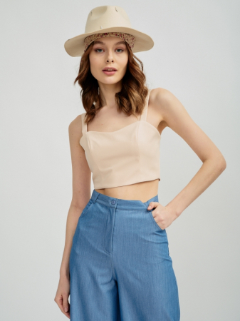 Топ из костюмной однотонной ткани, прилегающего силуэта, на подкладке. На бретелях. Укороченный. Рельефы на полочке. По центру спинки контрастная металлическая молния. Рост модели 170 см. Изделие на модели 42р-ра. Длина изделия 15,5 см. Машинная стирка при 30 градусах
