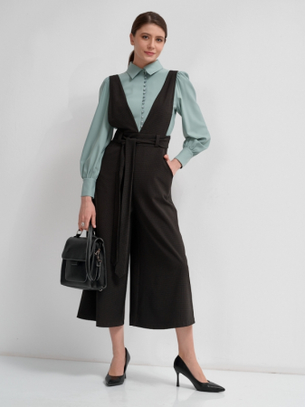 Женский комбинезон из костюмной однотонной ткани и ткани в клетку. Силуэт песочные часы и брюки подчеркнет талию и утонченность. Сдержанные и минималистичные линии лифа и V-образный вырез, подчеркивает стиль. Широкие брюки и карманы в боковых швах позволит чувствовать себя предельно комфортно и уютно. Застежка на потайную молнию. В комплекте съёмный пояс из основной ткани для завершения образа. Превосходство такого Комбинезона скрывается в его разносторонности, позволяя создать практически не ограниченное количество вариантов нарядов.