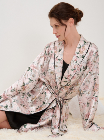 Женский халат на запах и сорочка из ткани Армани-шелк позволят выглядеть привлекательно и эффектно даже дома. Шалевый воротник, втачной длинный рукав и съёмный пояс из основной ткани, украшены декоративным контрастным кантом. Ткань отличается мягкой текстурой и необычайной легкостью, граничащей с невесомостью. Она нежно струится по телу, не стесняя движений, дарит ощущение комфорта и способствует расслаблению после насыщенного трудового дня. Рост модели 175 см. Изделие на модели 42 размера. Длина изделия по спинке 95 см. Машинная стирка при 30 градусах.
