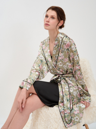 Женский халат на запах и сорочка из ткани Армани-шелк позволят выглядеть привлекательно и эффектно даже дома. Шалевый воротник, втачной длинный рукав и съёмный пояс из основной ткани, украшены декоративным контрастным кантом. Ткань отличается мягкой текстурой и необычайной легкостью, граничащей с невесомостью. Она нежно струится по телу, не стесняя движений, дарит ощущение комфорта и способствует расслаблению после насыщенного трудового дня. Рост модели 175 см. Изделие на модели 42 размера. Длина изделия по спинке 95 см. Машинная стирка при 30 градусах.