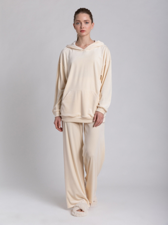 Женское худи - оверсайз из мягкого велюра на трикотажной основе. Капюшон на трикотажной подкладке в тон. Спущенная линия плеча. Длинный прямой рукав на манжете. Худи очень удобное и стильное, а значит легко впишется в комплект не только домашней одежды, но и одежды для прогулок и отдыха. Для удобства на полочке имеется карман-«кенгуру». Ткань легкая и очень приятная к телу, подарит невероятный комфорт и уют своей обладательнице. Рост модели 175 см. Изделие на модели 42р-ра. Длина изделия 106.1 см. Машинная стирка при 30 градусах.