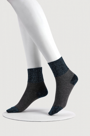 Представляем вам стильные и элегантные женские носки с люрексом. Эти носки выполнены в темно-сером цвете с бирюзовым люрексом на пятке, на носке и по верху, что придает им особый блеск и изысканность.