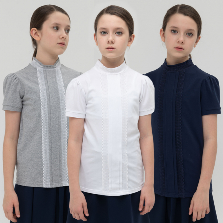 Состав: 93%хлопок 7%эластанОписание: Школьная футболка для девочки из хлопкового трикотажа. Мягкая ткань хорошо пропускает воздух, не электризуется. Кружево по бокам центральной складки спереди и по воротнику, а также лёгкая сборка рукава вносят немного романтики в классический стиль. Практична в повседневной носке, не растягивается и не теряет цвет после стирок.