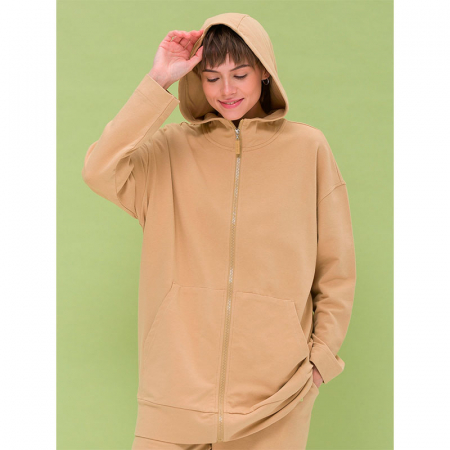 Состав: 96%хлопок 4%эластанОписание: Удлиненная женская толстовка с капюшоном из футера. Теплая, мягкая, приятная на ощупь ткань с 96% хлопка в составе – почти не мнется, сохраняет форму даже после частых стирок. Тракторная молния максимально прочная, не заедает. Большие и функциональные карманы-кенгуру. Широкие манжеты на рукавах и по низу изделия из основной ткани. Толстовка снизу свободная и без фиксации по бедрам. Сбоку на спинке текстовый принт с рецептом счастья – оригинальная фишка модели. Стильно выглядит в дуэте с джоггерами. Подходит на каждый день, для активного отдыха и путешествий.