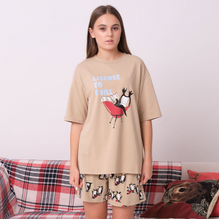 Состав: верх: 95%хлопок 5%эластан, низ: 95%хлопок 5%эластанОписание: Пижама женская с шортами. В составе ткани преобладает высококачественный хлопок — домашняя пижама мягкая, гипоаллергенная и хорошо пропускает воздух. В пижаме вам будет комфортно и уютно во время сна. Эластан помогает модели надолго сохранить первоначальную форму. Футболка свободная, плечо спущено, рукава широкие — в пижаме очень удобно спать. В поясе шорт мягкая и широкая резинка — не перекручивается и не давит. Отделка горловины из эластичной рибаны — она не растягивается, пижаму удобно надевать и снимать. Костюм домашний женский украшен прикольным принтом, надпись переводится: «лецензия на чилл» — поймайте позитивное настроение! Домашний комплект с шортами неприхотлив в уходе. Принты эластичные и прочные, без проблем переносит частые стирки. Помните о правильном уходе за изделием: рекомендуется стирать при температуре не выше 30 °C, без предварительного замачивания, с изнанки. Это поможет сохранить качество и цвет пижамы на длительное время. Не забывайте о выборе правильного размера. Используйте таблицу размеров на фотографии, чтобы выбрать подходящий для себя вариант. Обратите внимание, что цвет товара на экране вашего устройства может отличаться от реального.