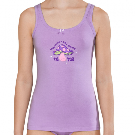 Состав: 93%хлопок 7%эластанОписание: Майка детская для девочки. Нательная майка для девочки выполнена из ткани с высоким содержанием хлопка — она приятна на ощупь, гипоаллергенна и великолепно пропускает воздух. Эластан помогает изделию сохранять отличную форму в течение длительного времени. Качественная ткань и правильный крой гарантируют комфортную посадку. Горловина и проймы обработаны эластичным пайпингом в тон — они не растягиваются и надолго сохраняют прекрасный внешний вид. Хлопковая майка нежного сиреневого цвета (актуальный оттенок лаванды) понравится любой девочке. Красивая майка декорирована позитивным принтом в виде грибочка, надпись переводится: «хорошие вещи произойдут с тобой». Принт мягкий и устойчивый, легко переносит частые стирки. Майка детская для девочек — идеальный выбор для повседневной носки под одеждой, а также она подходит для летнего отдыха и в качестве домашней одежды. Помните о правильном уходе за изделием: рекомендуется стирать при температуре не выше 30 °C, без предварительного замачивания, с изнанки. Это поможет сохранить качество и цвет майки на длительное время. Не забывайте о выборе правильного размера. Используйте таблицу размеров на фотографии, чтобы выбрать подходящий вариант для вашей девочки. Обратите внимание, что цвет товара на экране вашего устройства может отличаться от реального.
