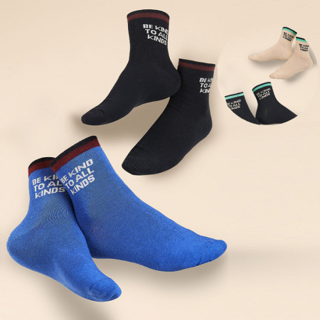 Состав: 76%хлопок 21%полиэстер 3%эластанОписание: Набор из 2-х пар стандартной длины носков для детей. Носки с высоким содержанием хлопка и добавлением эластана не спадают, не садятся, не теряют форму. Не сползают с ног, с мягкой нетугой резинкой, которая не сдавливает ногу. Перевод принта "быть добрым ко всем". Подойдут для мальчиков и девочек.