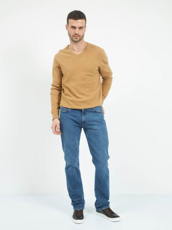 Мужские модные джинсы с пятью карманами. Посадка Slim fit (облегающие по бедру), средняя талия спереди, высокая сзади.. Застежка на молнии. Немного зауженные к низу. Выполнены из слабоэластичной ткани denim comfort stretch. Средняя стирка с потёртостями и "усами" спереди и потёртостями сзади. Параметры указаны для размера 32. Длина внутреннего шва - 84,0 см.
