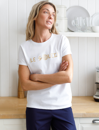 Перевод принта: "le soleil (фр.) - солнце". Футболка прямого кроя выполнена из 100% хлопка. Базовая модель дополнена лаконичным авторским принтом. Легко впишется в повседневный гардероб. Изделие хорошо держит форму и обеспечивает комфортный микроклимат в течение дня.