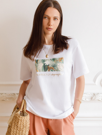 Перевод принта: "Perfectly imperfect - идеально несовершенная". Футболка прямого кроя выполнена из 100% хлопка. Базовая модель с лаконичным авторским принтом легко впишется в повседневный гардероб. Хорошо держит форму и обеспечивает комфортный микроклимат в течение дня.
