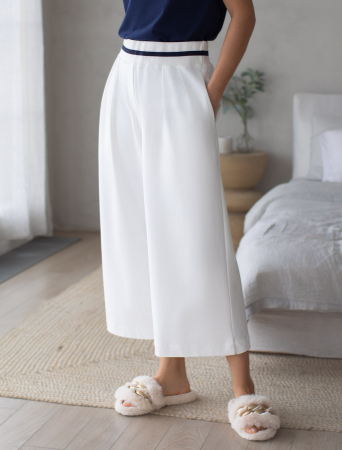 Свободные брюки прямого силуэта выполнены из эластичного футера двухнитки. Длина изделия до щиколотки. В боковых швах расположены карманы. Внутренняя часть кармана из тонкого хлопка в тон полотна. Модель дополнена эластичным поясом, с контрастной полосой и золотистым логотипом бренда. Сочетается в костюме с джемпером D49.083 и D49.086. Правила ухода: использовать жидкое моющее средство (гель для стирки), добавлять к нему кислородный пятновыводитель для цветных вещей, и салфетки (защита от окрашивания). Стирка при 30 градусах, отжим на максимальных оборотах.