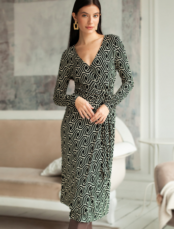 Платье на запАх сшито из трикотажной вискозы с эластаном. V-вырез с мини-копкой на борте с внутренней стороны для фиксации выреза декольте. Запах сходится и завязывается на боковой-пояс ленту. Модель подчеркивает достоинства и изгибы фигуры. А геометрический принт скрывает любые неровности. Роскошь и комфорт, одновременно подчеркивающие стиль, женственность и красоту.