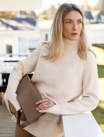 Свитер в овсяном оттенке выполнен из уютной пряжи крупной вязки с ангорой и легким пушистым мохером, поэтому изделие получилось особенно приятным на ощупь. Пряжу укрепили нитями нейлона, благодаря чему изделие не вытянется со временем и сохранит свою форму. Лаконичную модель дополнили металлическим логотипом бренда.